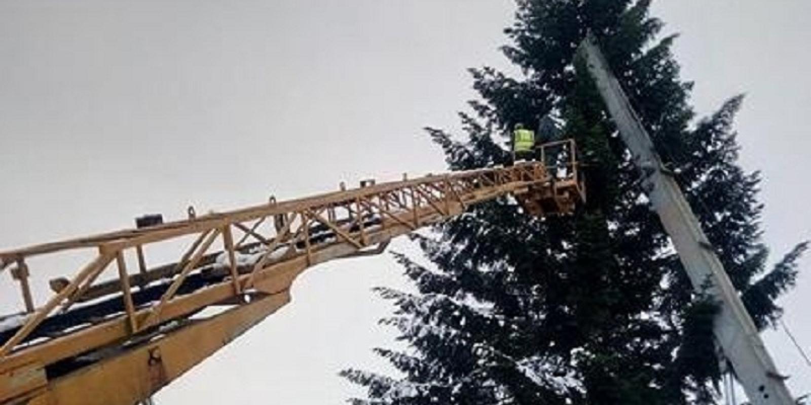 Сьогодні, на території приватної ділянки в смт. Брюховичі працівники ЛКП зрізають головну ялинку для міста Лева. Про це повідомляє «Ulvovi.info».